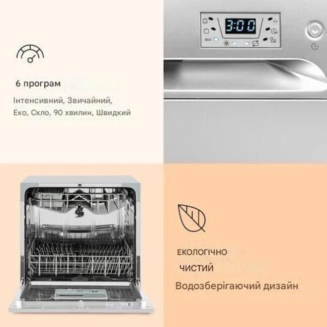 - 6 програм : Інтенсивна, Нормальна, Еко, Скло, 90 хвилин і Швидка