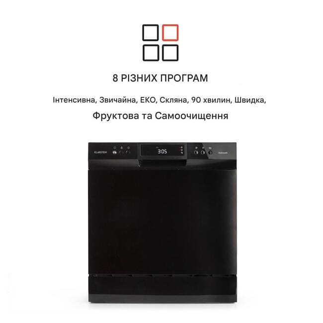 - 8 програм: Еко, Нормальна, Інтенсивна, Стакан, 90 хвилин, Швидка, Фрукти, Самоочищення