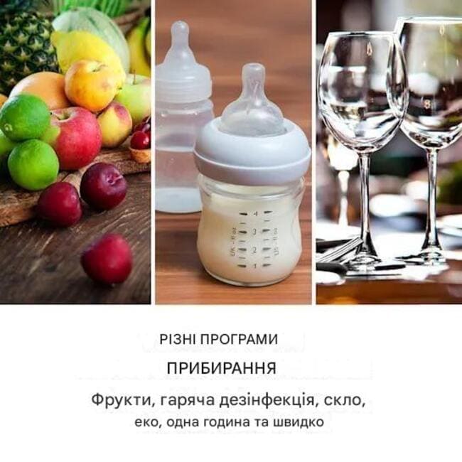 - 6 програм: Фрукти, Гаряча дезінфекція, Еко, Стакан 1 година, Швидка