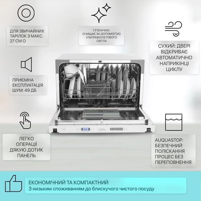 - 6 програм: Інтенсивна, Нормальна, ЕКО, Стакан, Швидка та 90 хвилин