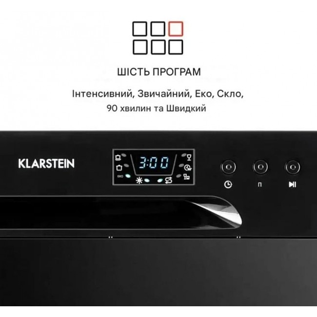 - шість програм: Інтенсивна, Універсальна, ЕКО, Склянка, Швидка та 90 хвилин.