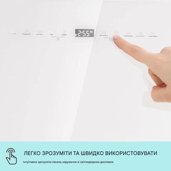 - 7 програм: ЕКО, гігієна, інтенсивне очищення, очищення скла, програма 58 хв, швидке очищення та режим самоочищення