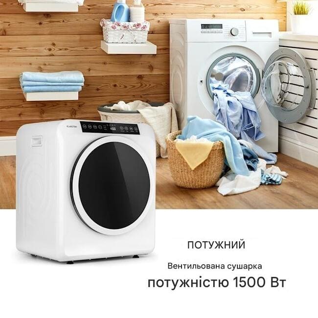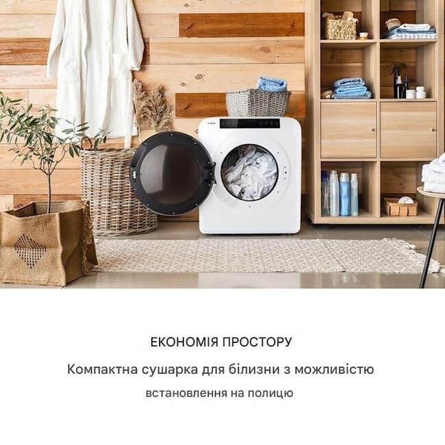 - Економія місця: компактна сушильна машина з можливістю установки на стійку