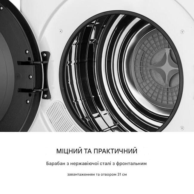- Міцний і практичний: передній завантажувальний барабан із нержавіючої сталі з хромованими дверцятами та отвором 31 см